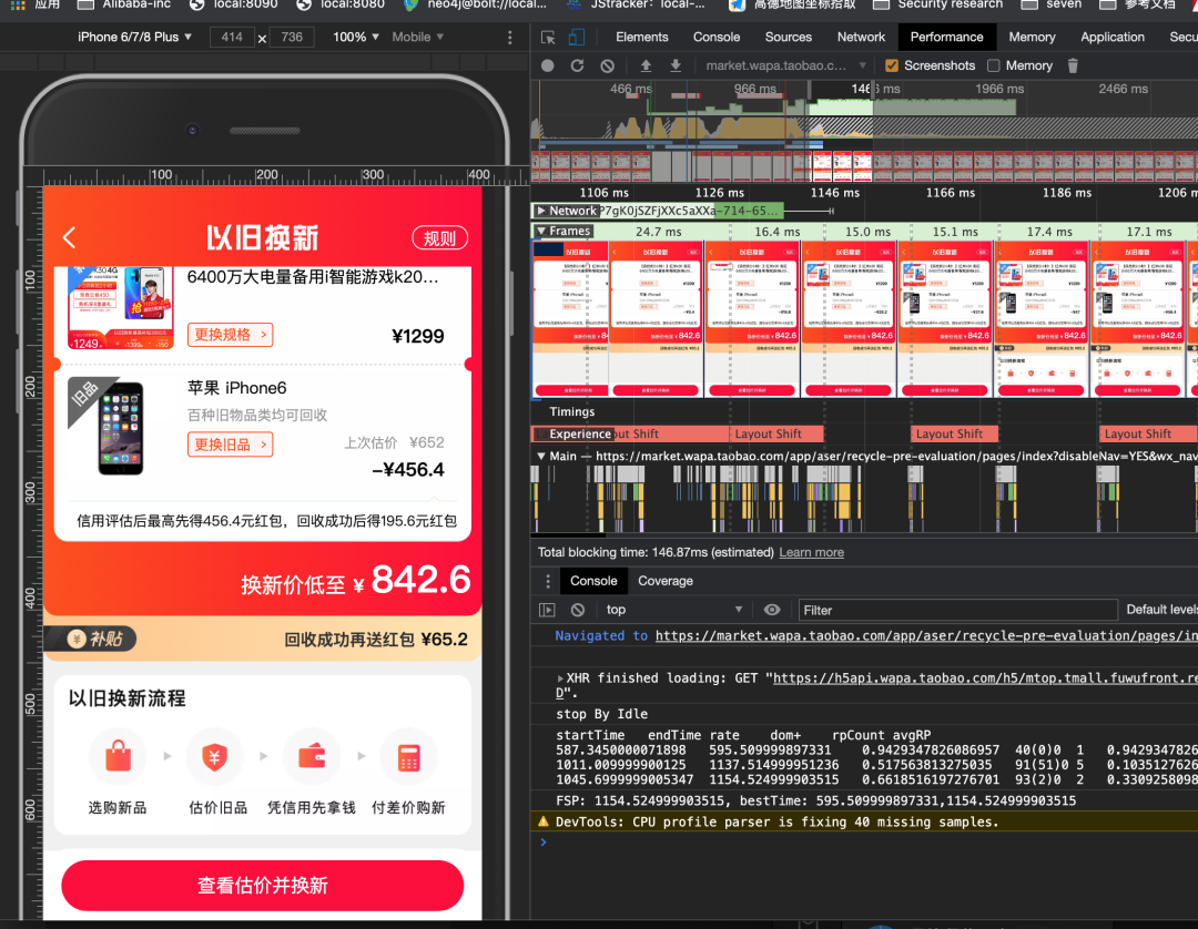 H5 类页面,一般没有 PC 渲染层级的多和复杂,相对需要判断的栈较浅, badcase 也较 PC 页面少一些,示例中的 H5 页面首屏时间计算结果为 1.15s,相比 performance 记录略早 30 毫秒左右,是一个比较理想的结果。