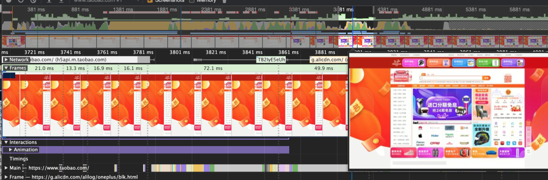 上图为淘宝 PC 首页的首屏渲染过程,X 轴为时间,Y 轴为每次渲染内容的首屏占比,可以看到 3.7 秒左右开始至 3.9s 结束后基本跌到 0 左右;