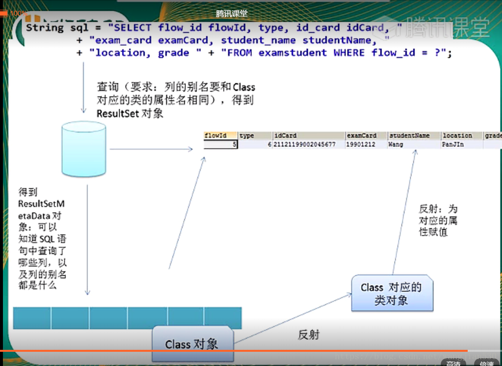 String sql = "SELECT flow_id flowId, type, id_card idCard, exam_card examCard, student_name studentName, "