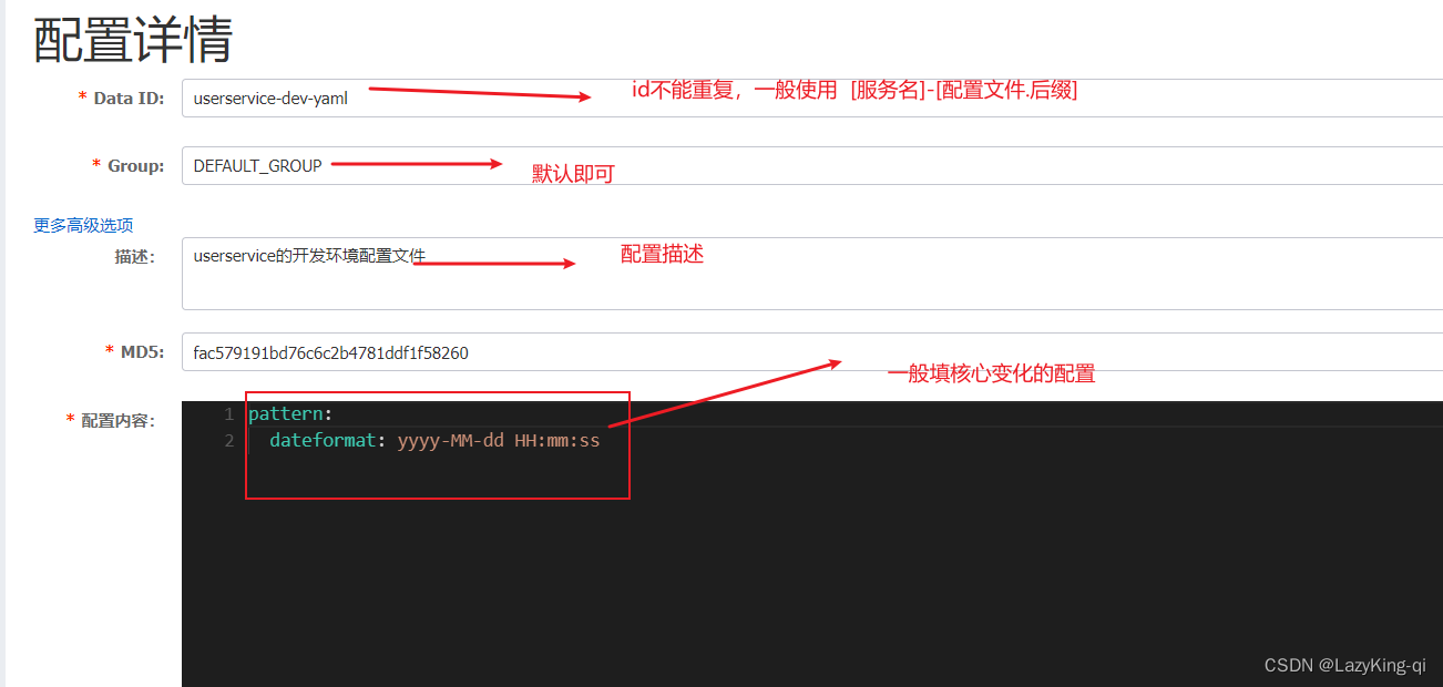 注意:如果你程序的yml设置了命名空间,就选则在命名空间添加配置,没有就在public里添加配置,否则服务启动会找不到
