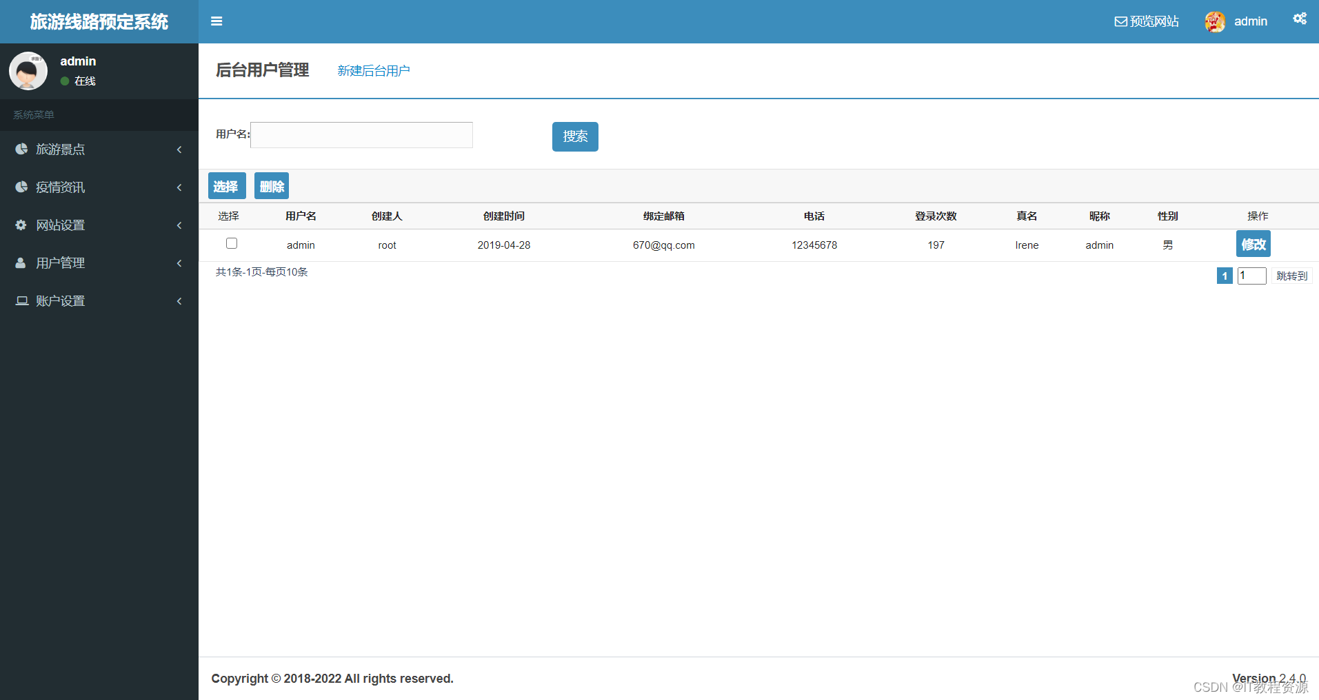 用户信息管理模块分为后台管理员信息的维护模块和前台注册用户的维护模块,并提供对各类用户的权限分配功能。