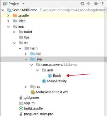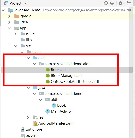 1.在java目录下创建一个包名com.ps.sevenaidldemo.aidl(随便取),然后创建Book.java实体类,这个实体类必须实现Parcelable接口,用于序列化和反序列化。