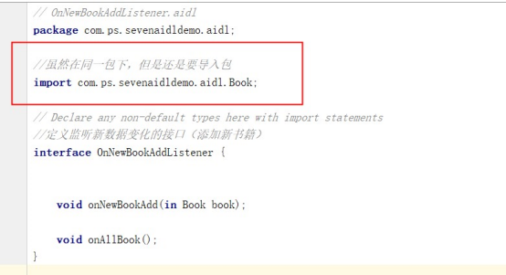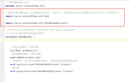 另外,IBookManager.aidl 和 OnNewBookAddListener.aidl中用到了Book类,虽然在同一包下,但是还是需要导入,这里只能手动导入。