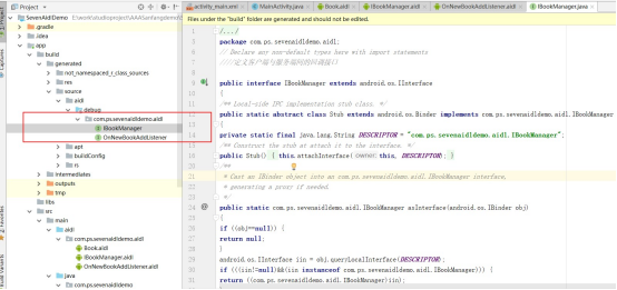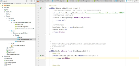 创建Binder 对象时,不能使用new Binder ()的方式,必须使用new IBookManager.Stub()创建Binder对象,这是AIDL接口文件自动生成的Binder对象。