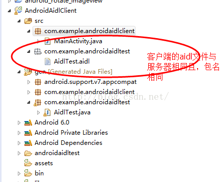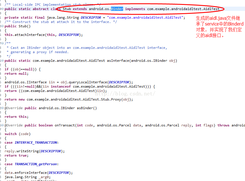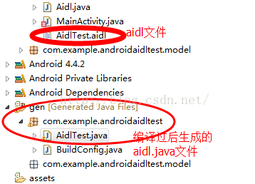 这样作为向外提供接口的server端就完成了。一般情况下,当你写完aidl文件,编译过后如果aidl文件没有语法问题会在应用的gen目录下生成aidl的Java文件。