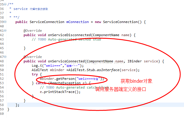 然后在activity中实现serviceConnect获取aidl返回的binder对象。进行通信。