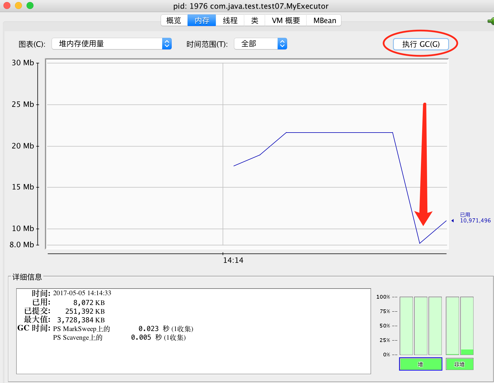 由图可见,线程池中只新创建了一个线程,for循环中创建了10个MyRunnable对象。线程执行完任务之后,10个对象并没有立即被回收。此时在jconsole中观察内存使用情况发现内存充足,于是在jconsole中手动触发一次GC,如下图