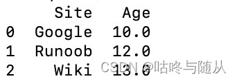 data = {'Site':['Google', 'Runoob', 'Wiki'], 'Age':[10, 12, 13]}