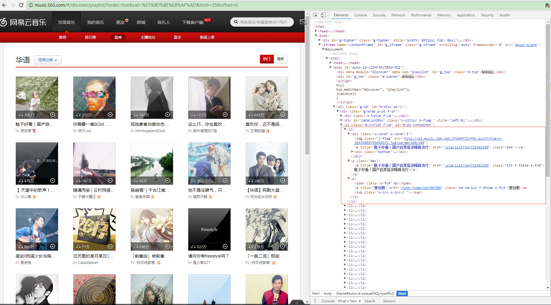 这是网易云音乐华语歌曲的分类链接http://music.163.com/#/discover/playlist/?order=hot&cat=华语&limit=35&offset=0,打开Chrome F12的Elements查看到页面源码,我们发现每页的歌单都在一个iframe浮窗上面,每首单曲的信息构成一个li标签,包含歌单图片、