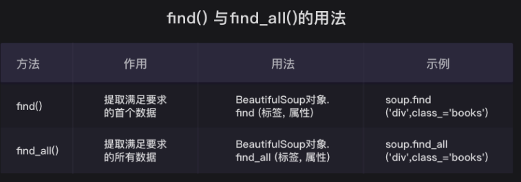 find()与find_all()是BeautifulSoup对象的两个方法,它们可以匹配html的标签和属性,把BeautifulSoup对象里符合要求的数据都提取出来。