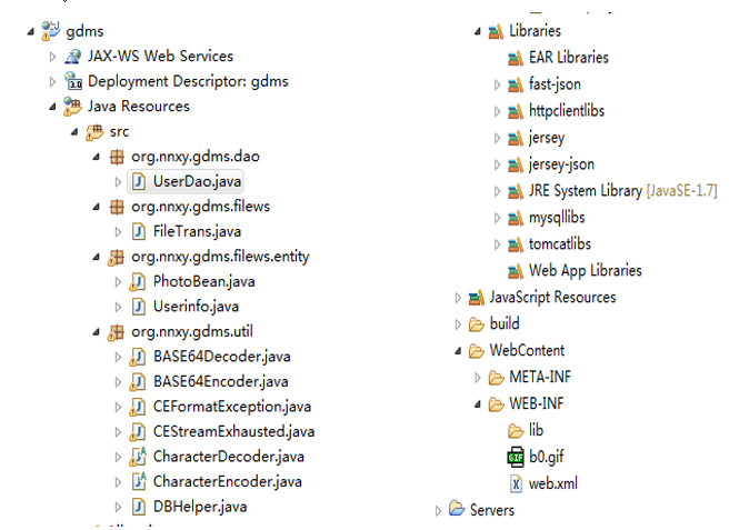 本次实训项目从整体而言,可分为gdms服务端工程和client客户端工程。gdms既为服务端工程,主要包含hello 、readfile(上传图片文件至Tomcat容器) 和finduser(数据库数据传输)。而client客户端主要功能为,TestClient(捕获http://172.19.36.37:8080/gdms/ws/nnxy/readfile内容,并转化成相应的图片文件),