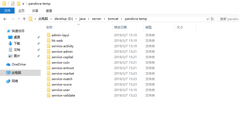 (2)创建文件夹D:javaservertomcatpandora-temp作为临时目录,然后在pandora-temp目录下分别创建对应的文件夹,如图: