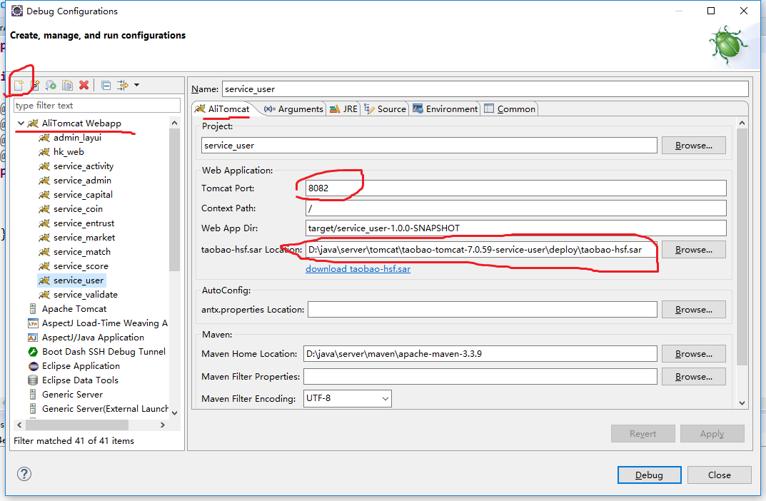 5、eclipse中配置启动设置,我这里以service-user为例: