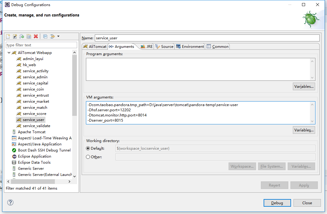 选择AliTomcat Webapp----点击左上角new launch configuration,然后找到AliTomcat选项卡如图配置端口号,选择对应服务pandoar容器的路径。然后切换到Arguments选项卡,配置如下JVM(注意标红:pandora.tmp_path为潘多拉容器临时目录,填写前面创建的对应目录即可。Dhsf.server.port为hsf的端口号,默认为12200,启动多个服务时候这里必须配置端口,否则会报错HSF-0016,端口被占用。建议服务之间隔一个端口号,比如第一个服务配置12200,第二个配置12202,第三个配置12204,因为启动时候HSF端口占用12200,Pandora QOS占用12201,时机占用了两个端口):