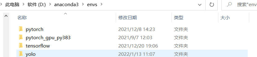 创建完虚拟环境后你可以在你的anaconda目录下面找到你创建的环境如下图所示: