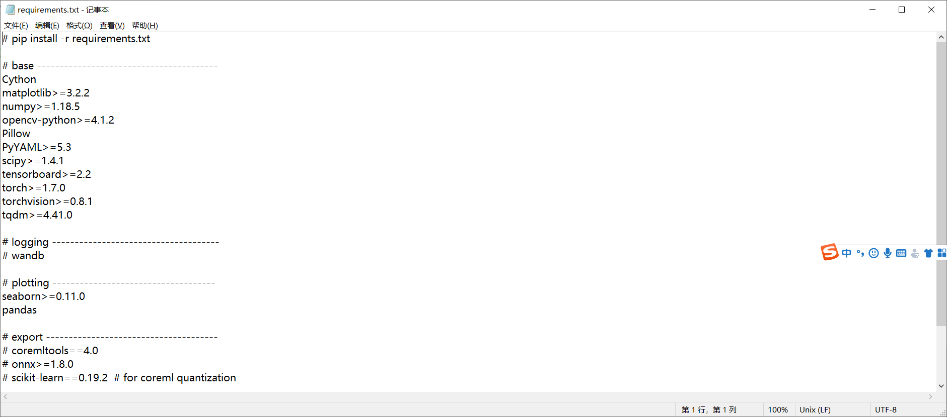 好了!源码下载好了之后,开始安装YOLOv5需要的库,大家打开根目录可以看到有一个requirements.txt如下: