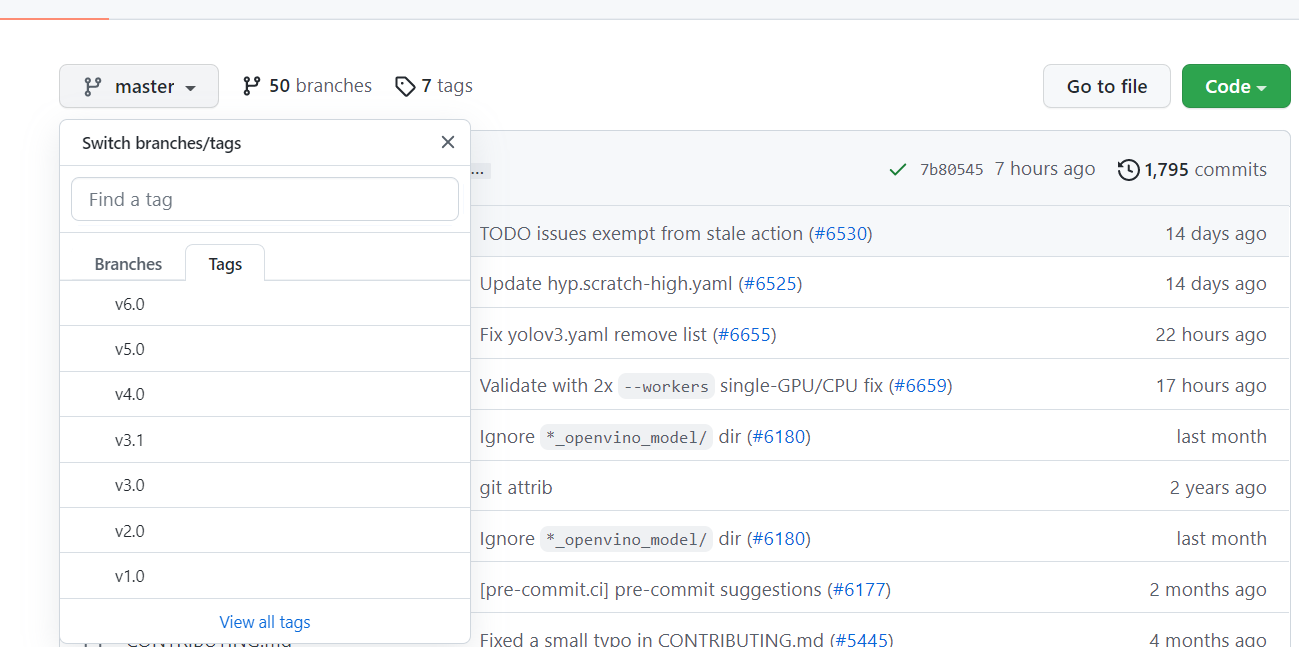 大家可以看到有很多不同的版本,就是在这里困扰了我很久,我自己下载的是V3.0版本的,但是有一个博主的界面设计使用的源码是V4.0,导致后面加载权重死活加载不出来,界面崩溃;所以大家做界面开发一定要用自己的或者跟博主的一样,好了建议你下载V4.0因为我是4.0版本的如果出现什么问题还可以讨论一下,