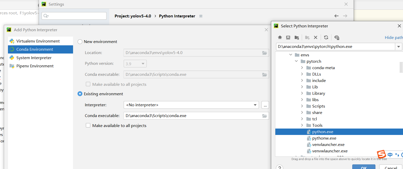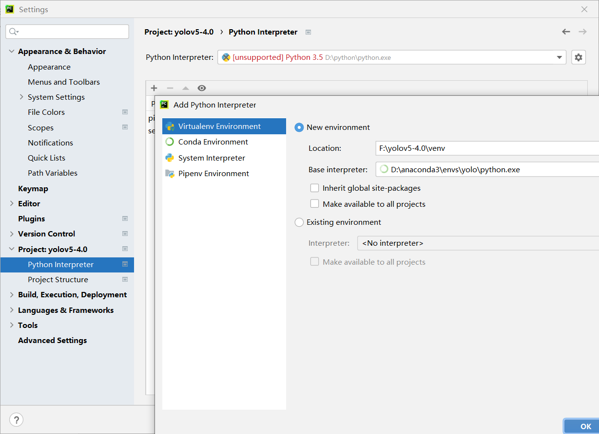 大家像这种都保存在英文路径下。导入我们刚刚的环境点击file-setting-projict-python编译器-点击设置就进入到此界面,然后点击conda-environment