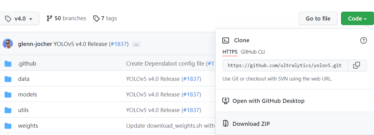 直接去GitHub官网下载点击此处下载YOLOV5源码