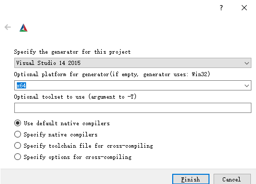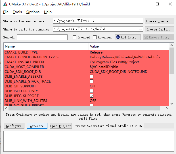 2、用cmake-gui编译如下图,source code选择dlib目录,build the binaries选择建立的build目录。然后点击configure,然 后选择visual studio14 2015,x64.