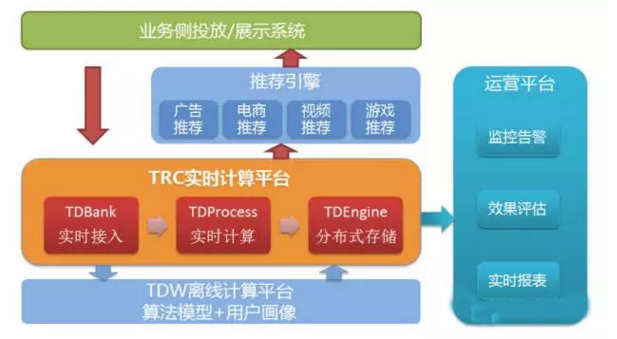 腾讯大数据实时计算平台TRC[1]由实时数据接入TDBank、实时数据处理TDProcess、和分布式K-V存储TDEngine等部分组成,其中TDBank主要负责从业务侧接入实时数据,如用户行为数据、物品信息数据等;TDProcess基于Storm对实时流入的数据进行计算,并利用TDEngine存储计算结果,以供推荐引擎等使用。