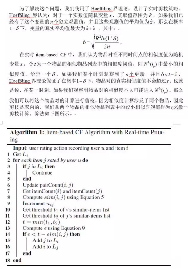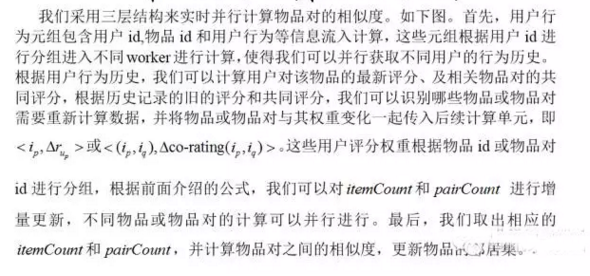 在实际计算过程中,我们发现,由于数据量太大,用户的某一个行为会带来大量的物品需要重新计算。具体来说,我们一般认为用户在某一时间段中交互的物品相互之间相关,即可能相似,这个时间段可能是一天或者一个月,那么一个用户行为带来的物品评分更新,可能会造成数十甚至数百个物品对的相似度需要重新计算,而这些物品对很多可能是不那么相似的,即