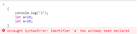 - 如果有重复的变量let会在编译阶段报错(代码先编译后执行,编译的时候发现有两个let就会直接报错,还没到执行阶段进行console)
