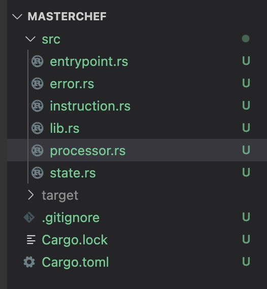 首先我们需要使用cargo新建一个Rust的lib项目,项目结构参考Solana官方例子进行划分: