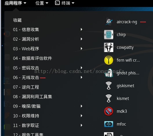 进入系统选择应用程序-》无线攻击-》aircrack-ng(一个评估网络无线安全的套件)