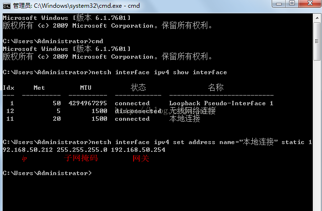 netsh interface ipv4 set address name="本地连接" static 192.168.1.2 255.255.255.0 192.168.1.1
