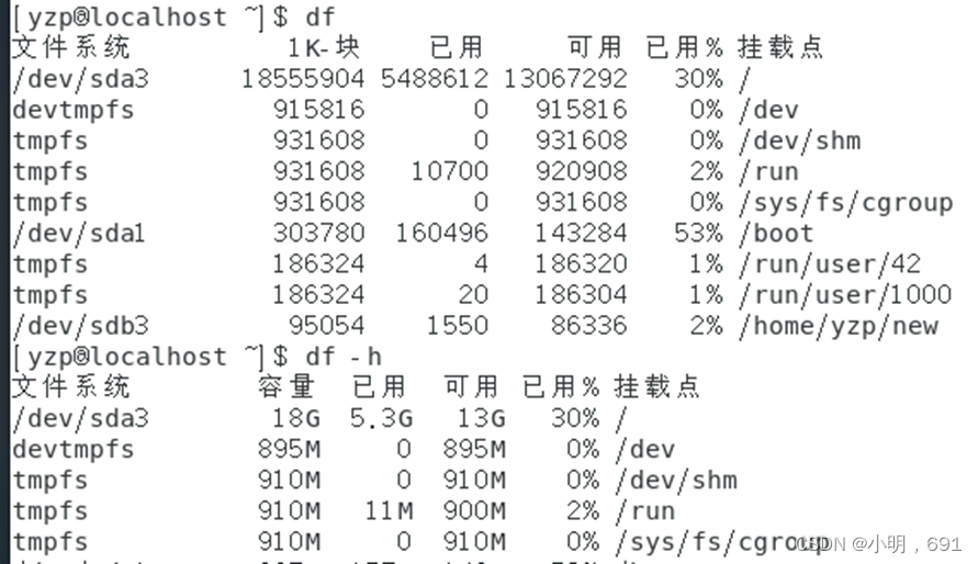 -h:使用人们习惯的 KB、MB 或 GB 为单位显示文件系统空间