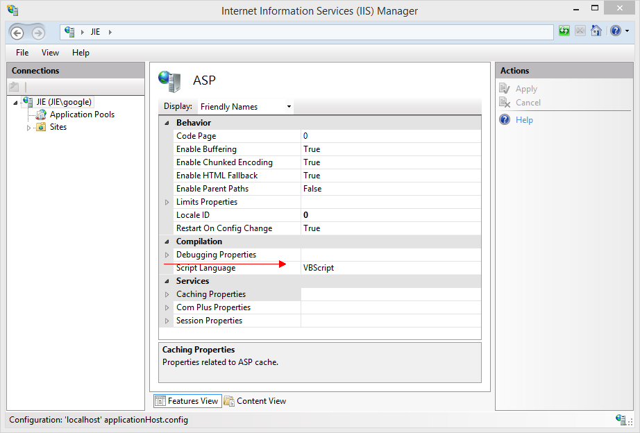 2 双击iis分组中的asp图标,已在上图中用红色箭头标出,以下截图中使用同样方法指出操作对象,不再重复说明。