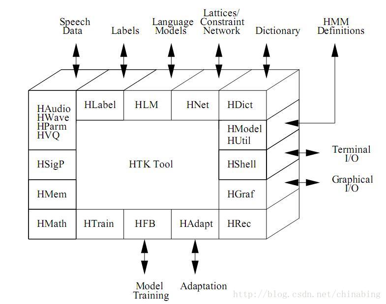 所有的语音输入和输出都是通过HWAVE(waveformlevel)或HPARM(parameterizedlevel)。除了提供一致的接口,HWAVE和HLABEL还支持多种文件格式,并容许数据从其他系统导入。HAUDIO支持直接的音频输入,HGRAF支持简单的交互图形。HUTIL支持一些utility routines,用于操控HMMs,HTRAIN和HFB支持各种HTK训练工具。HADAPT支持各种HTK调整工具。最后,HREC包含主要的识别处理函数。