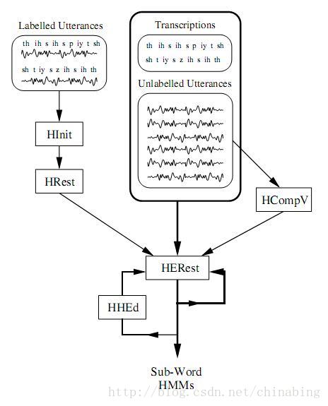 当不存在fully labelled bootstrap data, 使用HCompV进行初始化,用到部分训练数据。