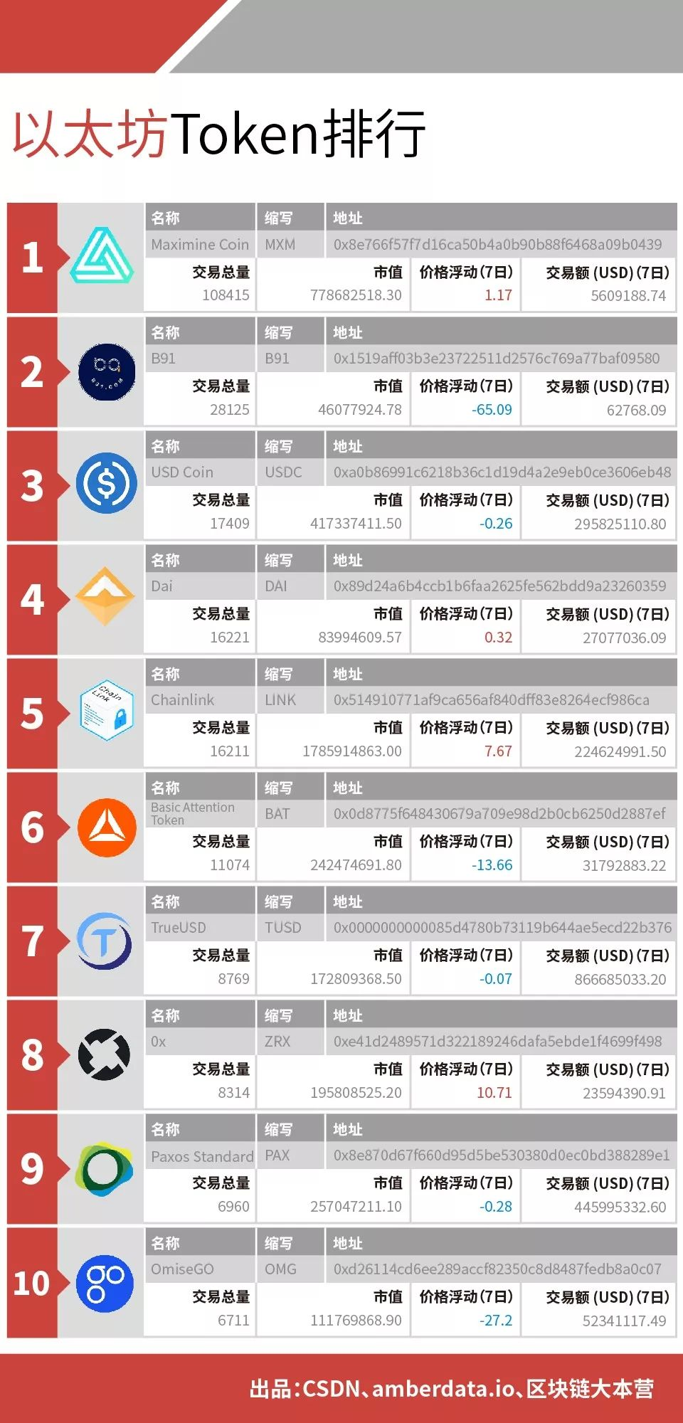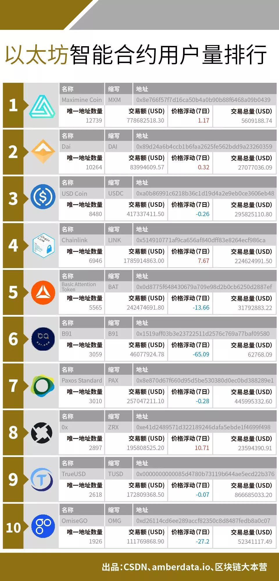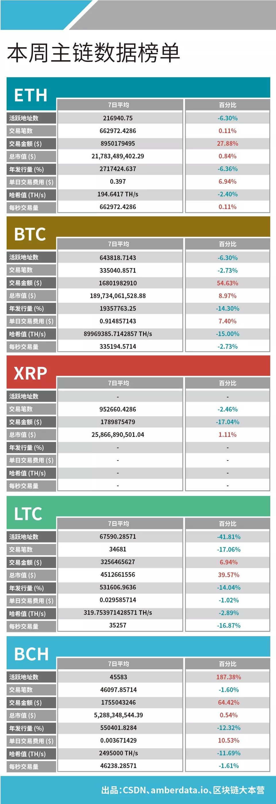 「区块链数据周榜」由CSDN、区块链大本营(ID:blockchain_camp)、数字资产数据平台Amberdata联合打造,每周对主链及主要数字资产的表现及走向进行排名。