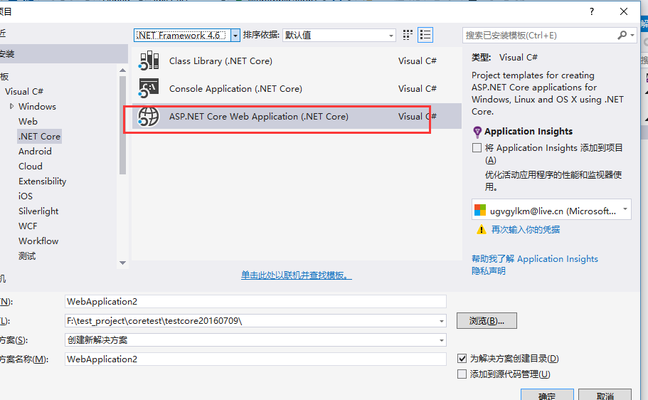 一.首先用vs 创建一个asp.net core 应该程序名称为 aspnetcoretest