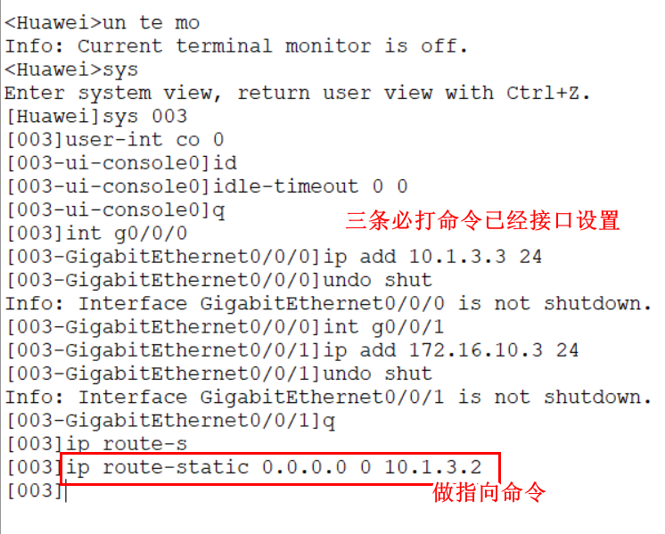 []ip route-static 0.0.0.0 0 10.1.3.2 //配置静态路由,下一跳入接口 10.1.3.2