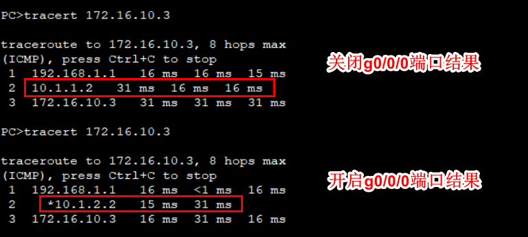 我们需要在路由器A里关闭g0/0/0端口进行测试。