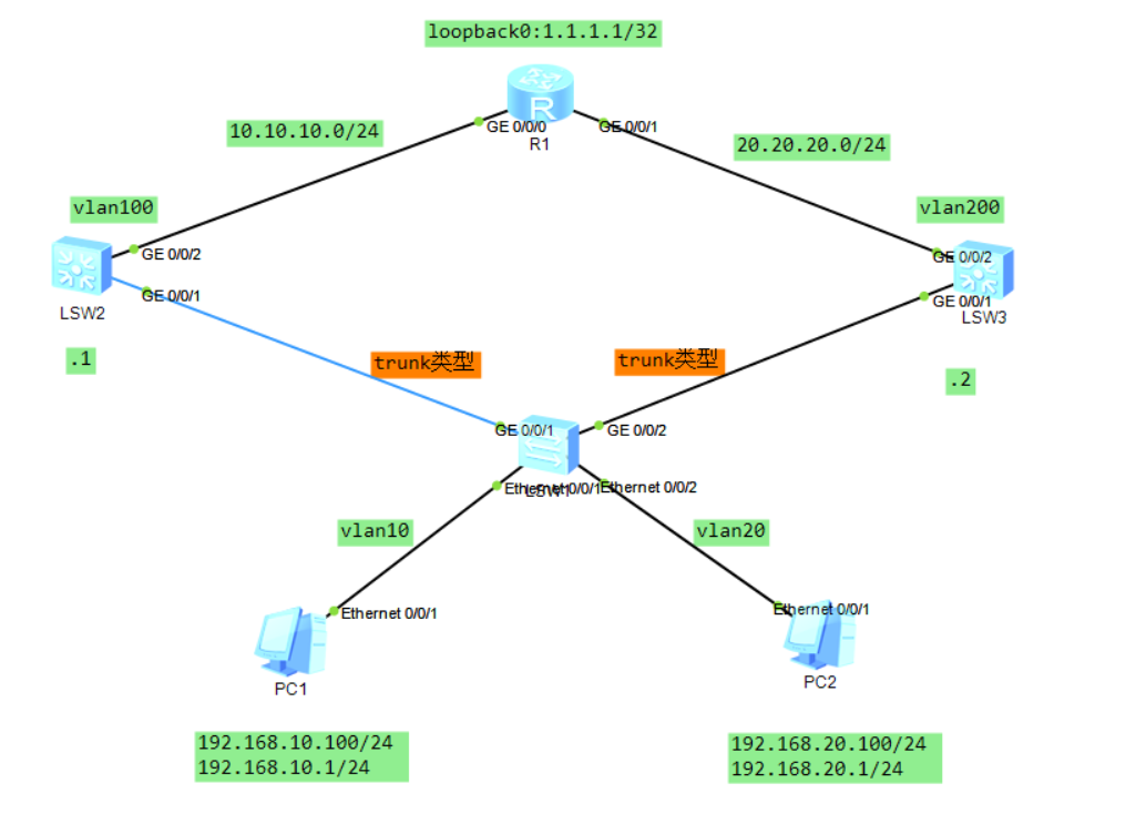 []port link-type trunk //设置trunk类型