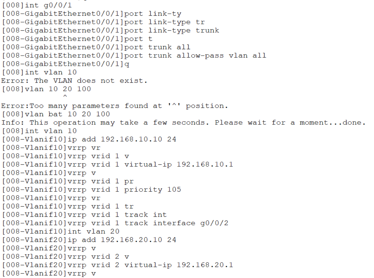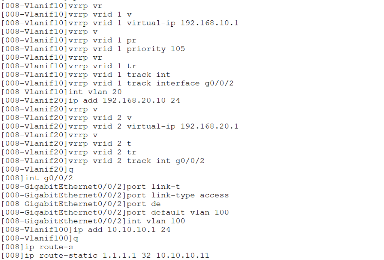 []vrrp vrid 1 track int g0/0/2//跟踪上行链路接口g0/0/2,若g0/0/2连接的链路坏掉,让其自动降级,默认降10