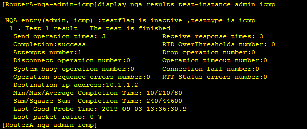 2.使用NQA ICMP测试功能,测试报文在本端(RouterA)和指定的目的端(RouterB)之间的往返时间。