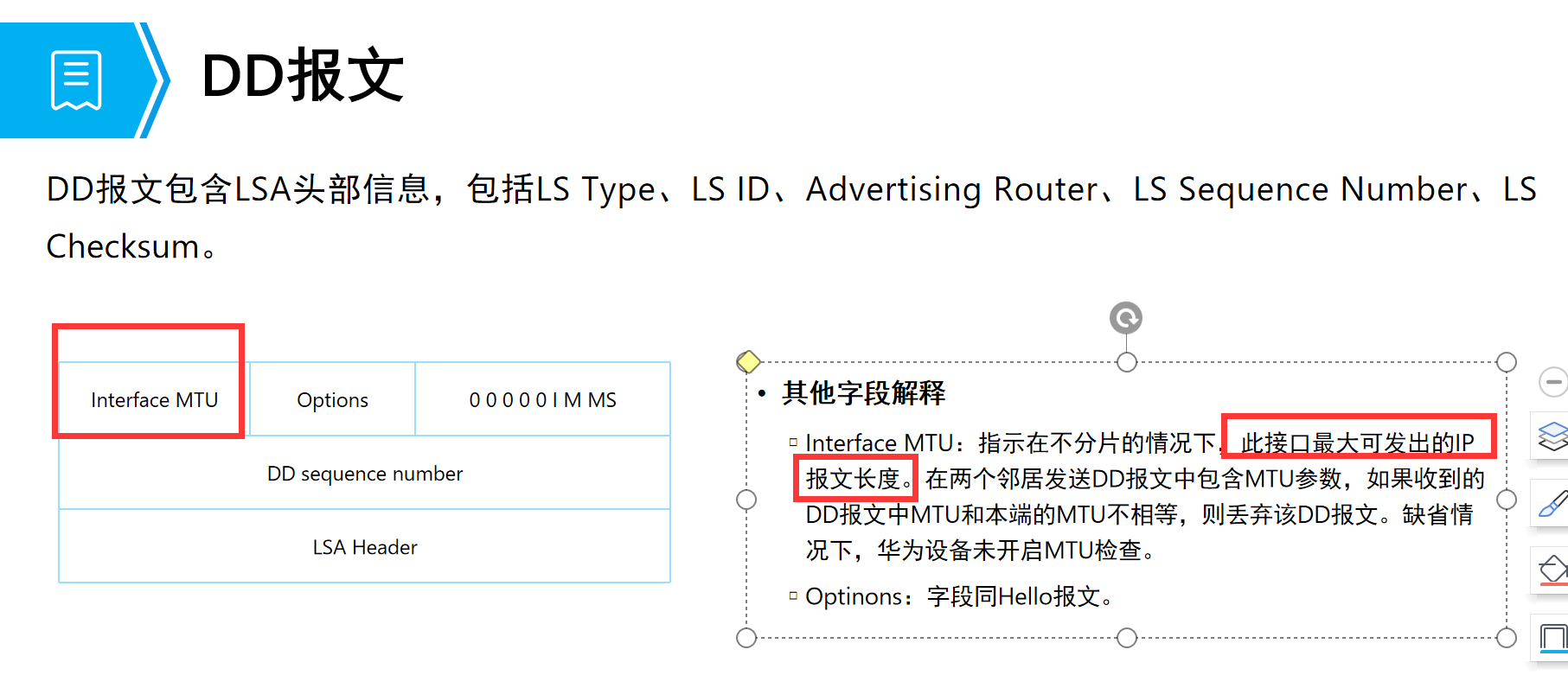 在dd报文之间,携带MTU字段(MTU:接口可发出的最大IP报文的长度,默认为1500)。