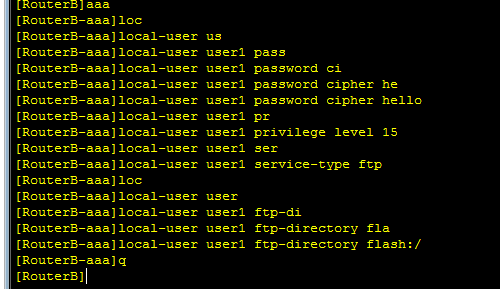 2.RouterB作为FTP Server,登录FTP服务器的用户名为user1,密码为hello,要下载的文件名为gelai.txt。