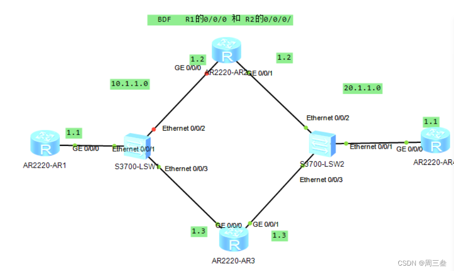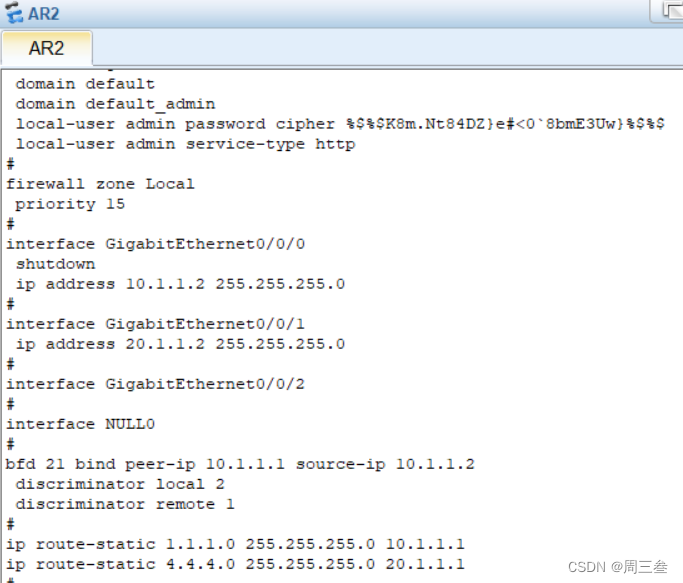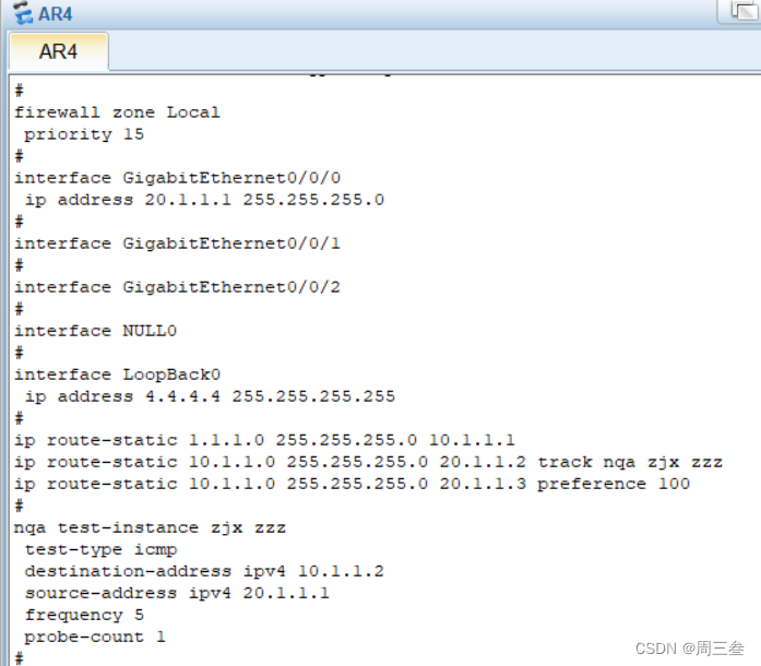 注意事项 R1到R4是静态不能直接写 0/0/0的端口 应该写 R1 的回环地址. R4到R1也是如此否则实验down掉