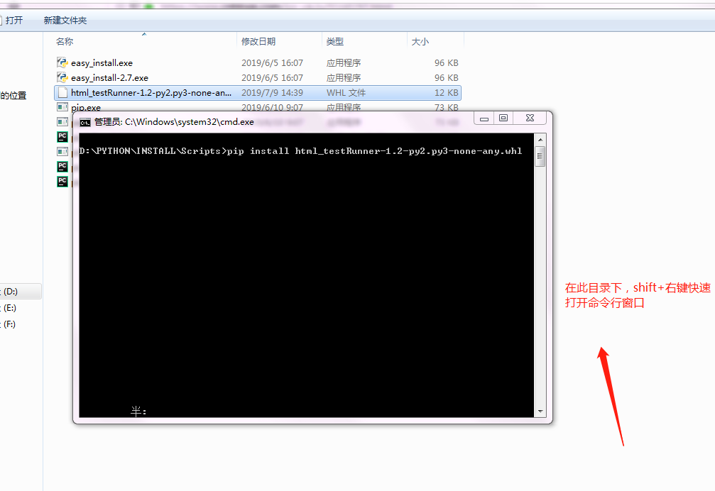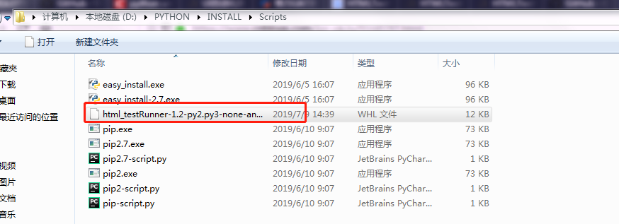 2、下载HTMLTestRunner安装包(下载地址:https://pypi.org/project/html-testRunner/#files),将安装包放在Python安装目录下的Scripts文件夹中,然后在此文件夹中打开命令行窗口,