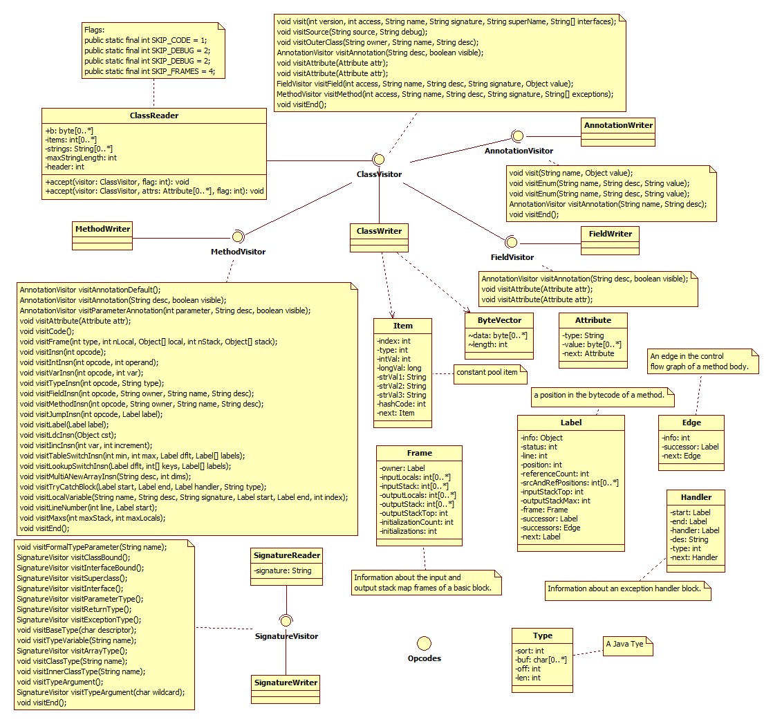 在ASM的核心实现中,它主要有以下几个类、接口(在org.objectweb.asm包中):ClassReader类:字节码的读取与分析引擎。它采用类似SAX的事件读取机制,每当有事件发生时,调用注册的ClassVisitor、AnnotationVisitor、FieldVisitor、MethodVisitor做相应的处理。