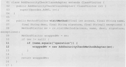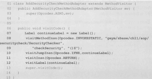 | AddSecurityCheckClassAdapter类覆盖了MethodVisitor的visitCode()方法。当访问到方法的字节码时,在第7~12行,织入了对SecurityChecker。checkSecurity()的调用。如果checkSecurity()返回了false(栈顶为0),根据指令ifne,跳转不会发生,程序返回。如果checkSecurity()返回了true(栈顶为1),则指令ifne发生跳转,继续执行原先的operation()操作 |