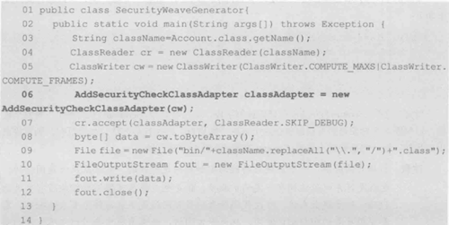- 下面的SecurityWeaveGenerator类,将checkSecutrity()函数放置到operation()函数的第1行执行。它的核心是代码第6行的AddSecurityCheckClassAdapter类。这是一个ClassVisitor,它负责实际的字节码织入操作。在代码的第8~12行,将新生成的Account类写入文件,覆盖由Java编译器产生的Account类的Class文件;