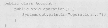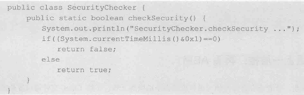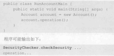 | 该代码模拟了权限校验,通过随机方式给出是否校验通过。现在系统要做的就是将SecurityChecker.checkSecurity()函数置于Account.operation()函数之前运行,如果权限校验失败,则阻止Account.operation()继续处理; |