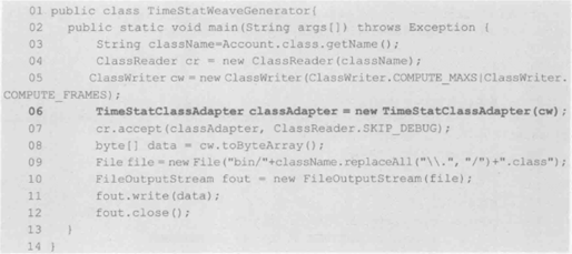 | 第6行使用TimeStatClassAdapter类,完成具体的字节码修改工作。修改完成后,第9~12行写入Class文件,覆盖原有的Class文件。 |